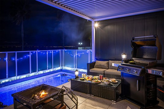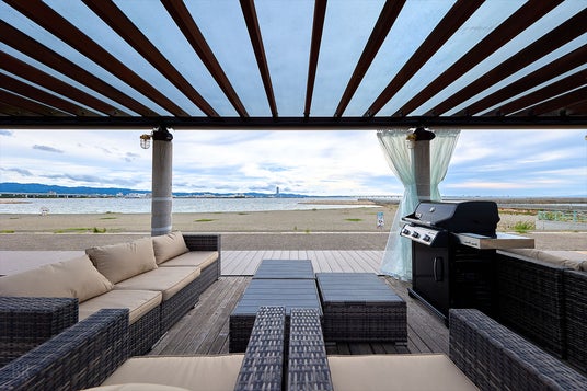 海を望むロケーションに位置する「アッパーBBQガーデン」では、日帰りBBQをお楽しみいただけます。屋根付きのBBQスペースには、ゆったりと寛げるソファ席を配置。目の前に広がるオーシャンビューを眺めながら、プライベート感のある時間をお過ごしいただけます。