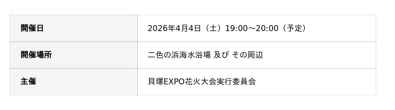 大阪府貝塚市の二色の浜公園を舞台に開催される大規模花火イベント「JAPAN FIREWORKS EXPO 2026 in Osaka - Nishikinohama」。大阪湾沿いの開放的なロケーションを活かし、横幅約300mにわたるワイド演出や最大10号玉の打ち上げを予定しており、大阪湾の夜空を彩ります。