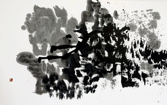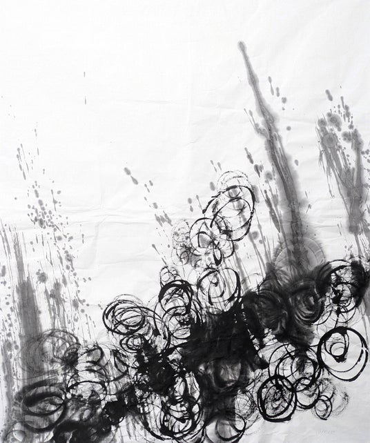 見えているものは、ほんの表層にすぎません。墨は沈み、線は迷い、書は意味を失うことで心の深層へと触れていきます。墨の滲み、掠れ、重なりは、理性の膜を破り、意識の奥へと沈み込む軌跡です。そこにあるのは答えではなく、深さそのもの。意味が発生する直前、思考がかたちになる手前。ここにあるのは言葉ではなく、痕跡であると、伊藤は語ります。