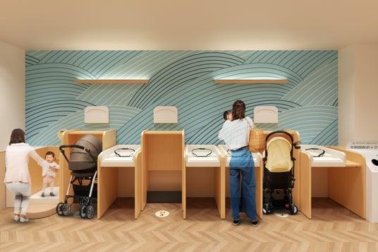 各フロアのベビールームを和泉市の南北で異なる土地の個性(北部の暮らし・文化、南部の里山)に着目した温かみのあるデザインにリニューアル。ベビーカー対応おむつ台、お着替えがしやすい台、授乳イス・ソファを一新し、使いやすく、ファミリーにとって嬉しい空間に生まれ変わりました。また、3F女子トイレ内パウダースペースも改装し、身支度の時間も心地よく過ごせる空間とします。