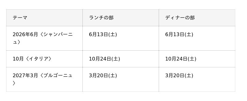 【料金】ランチの部/35,000円、ディナーの部/50,000円(各回につき・ペアリングコース付き)