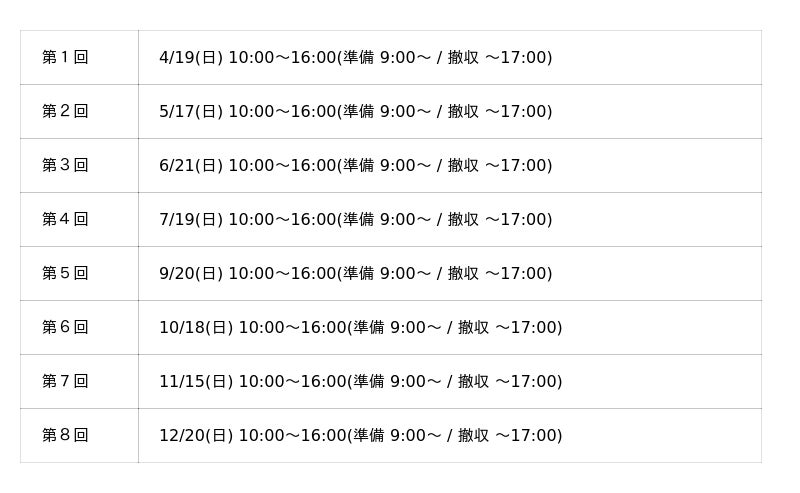 現在、第1回(4/19)以降の出店者を広く募集しています。個人・法人を問わず、「初めてのマルシェ出店」という方も歓迎です。出店に関するお問い合わせ・ご相談は、Instagram(@dough.info)のDMにてお気軽にご連絡ください。