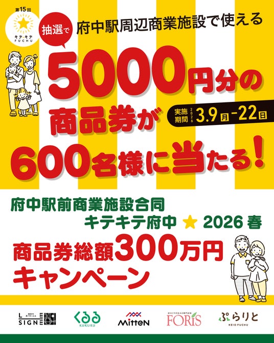 期間中、府中駅前商業施設の対象店舗にて500円以上お買い上げの方に、「抽選応募カード」を1枚お渡しします。応募券に掲載された2次元コードをスマートフォンで読み取り、ご応募いただくと抽選で600名様に5,000円分(総額300万円)の商品券が当たるキャンペーンを実施します。実施期間:2026年3月9日(月)~22日(日)