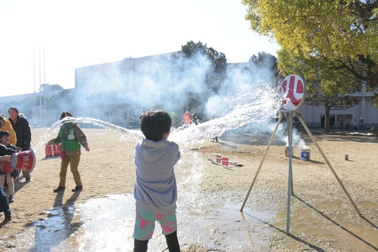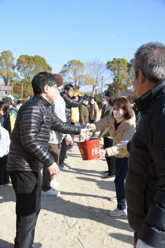 「バケツは真横ではなく、ジグザグに手渡してください」という消防職員からのアドバイスを受け、互いに向かい合う形でリレーを実施。