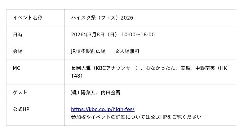 KBC九州朝日放送は、3月8日(日) JR博多駅前広場にて、高校生が主役のイベント「ハイスク祭(フェス)2026」を開催します。「教室じゃ狭すぎる。つくれ、高校生のじかん。」を合言葉に、福岡・佐賀の約50校の生徒たちが、学校の枠を超えてみんなでつくりあげる1日限りの大文化祭です。普段の学校生活や部活動では相見えることのない顔触れが一堂に会し、ここでしか見られないコラボレーションや熱い試合が繰り広げられます。