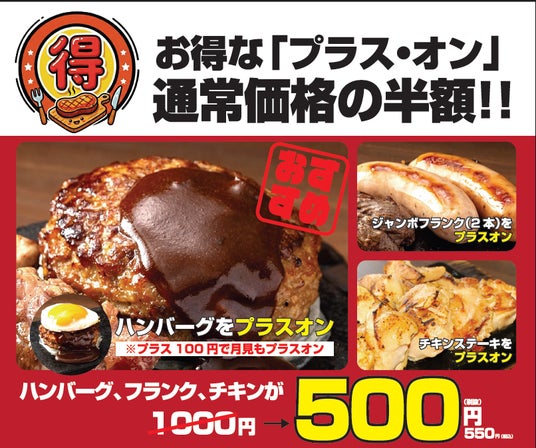 げんこつハンバーグ、ビックフランク(2本)、チキンステーキの3種の商品を、ステーキに追加する際に、通常の価格の半額でご提供!!