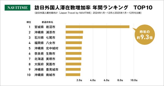 株式会社ナビタイムジャパン(代表取締役社長:大西 啓介、本社:東京都港区)のNAVITIMEデータ分析チームは、訪日外国人観光客向けのナビゲーションアプリ『Japan Travel by NAVITIME』の利用状況から、2025年の1年間を通じて訪日外国人旅行者の滞在が増加している地域の分析結果を発表いたします。