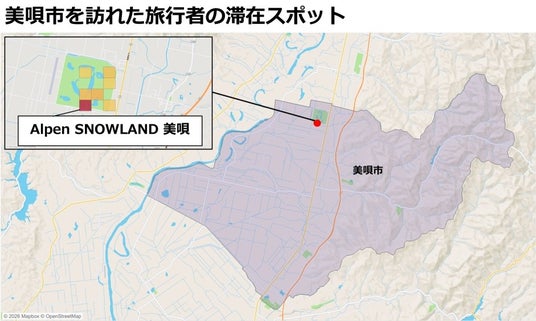 入出国空港は、新千歳空港がおよそ半数を占め、羽田空港、成田空港の利用も確認できます。美唄市での滞在エリアを確認すると、Alpen SNOWLAND美唄での滞在が多く確認でき、雪遊びを楽しんでいる様子がうかがえます。