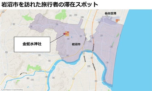 大型ショッピングモールがランキングを占める一方で、神社や温泉、雪といった日本特有の文化・体験に対する関心が見て取れた1位の宮城県岩沼市、3位の石川県七尾市、7位の北海道美唄市について具体的な滞在エリアや、周遊状況について分析しました。