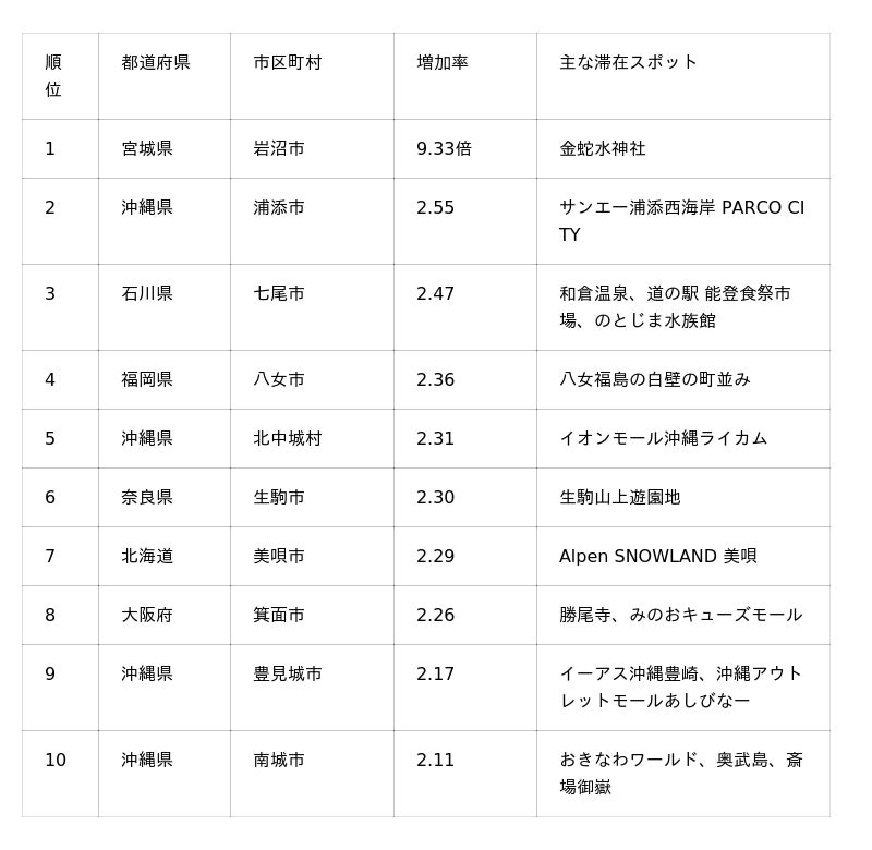 ~2025年 全国市区町村別 インバウンド滞在増加率ランキング1位は、宮城県岩沼市~