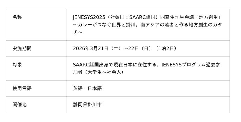 未来のアジア地域の発展を担う、SAARC諸国(南アジア)出身で日本に滞在する若者たちが静岡県掛川市を訪れ、「地方創生」をテーマに、各国に共通する地域課題の解決策を考えます。相互理解を深めながら、地域の国際化を促進することを目指す取り組みです。