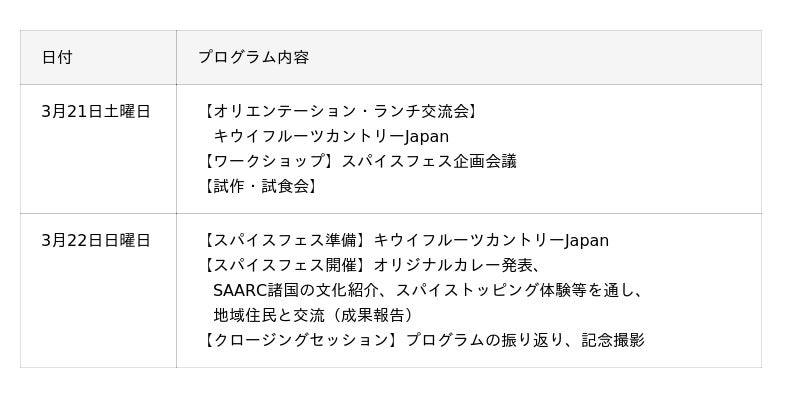 舞台となるのは、持続可能な農業・観光・教育の実践と体験学習を行う「キウイフルーツカントリーJapan」。同園特製カレーに参加者が南アジアのスパイスを合わせてつくる“オリジナルカレー”を、地域住民とともに味わうスパイスフェスを開催し、食文化を通じて南アジアと掛川の交流を深めます。