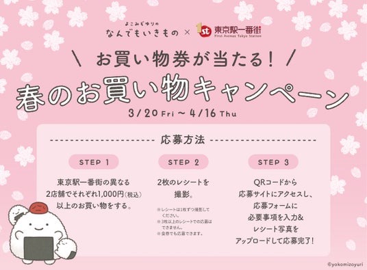 2026年3月20日(金・祝)より、「春のお買い物キャンペーン」を開催します。応募は、東京駅一番街の2店舗以上でお買い物やお食事をしたレシートで可能です。賞品には、東京駅一番街で使えるお買い物券やPOPUP STORE限定グッズなど、お買い物が楽しくなるプレゼントをご用意しています。また、応募いただいた方全員にオリジナル壁紙もプレゼントします。