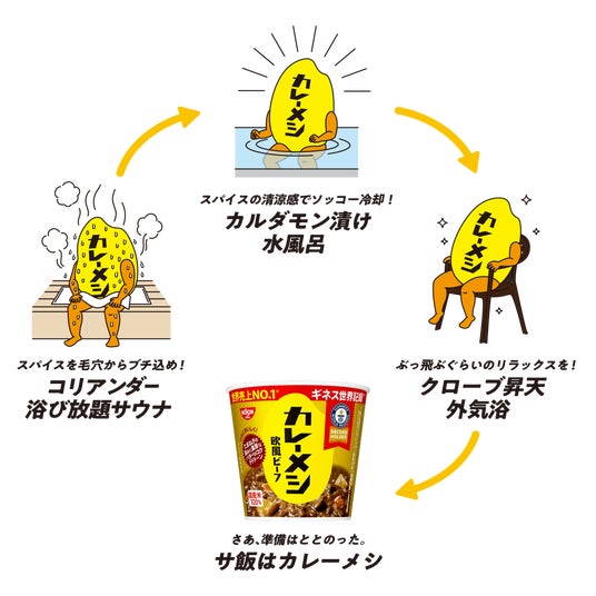「日清カレーメシ」は、お湯を注ぐだけで手軽に”カレー”を食べられることから、飲食スペースを併設していない銭湯や小規模なサウナでも楽しめる”サ飯”として親しまれています。