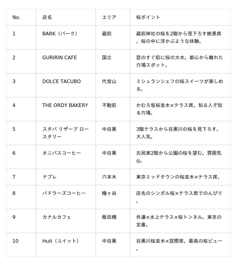 また、定番の中目黒エリアではスターバックス リザーブ ロースタリーやオニバスコーヒー、Huitなど複数の桜カフェが集まっていますが、満開期の週末は終日混雑が予想されます。不動前のTHE ORDY BAKERYや幡ヶ谷のパドラーズコーヒーなど穴場エリアも要チェックです。