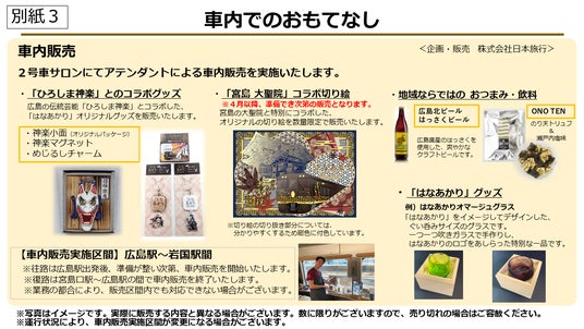 アテンダントが3名乗車し、地域ならではのお土産品や飲料、「はなあかり」グッズ、「ひろしま神楽」とのコラボグッズ、「宮島 大聖院」とコラボしたオリジナル切り絵等、多彩なアイテムを販売します。