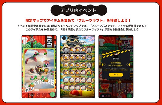 熊本県に関連したコラボ限定マップが登場!くまモンがライバルとして出現するなど、毎日のプレイがもっと楽しめます。コラボマップで獲得できる限定アイテムを集めて、熊本県産のフルーツ詰合せギフトがもらえる抽選券が獲得できるアイテム集めのほか、くまモンをモチーフ にデザインされた限定クローズ(アプリ内アバター衣装)も登場します。