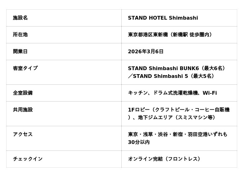ソフトウェアを主軸に、空間の価値を最大化するソリューション「StayX」を運営するmatsuri technologies株式会社(本社:東京都新宿区)は、インテグラル・リアルエステート株式会社(本社:東京都千代田区)との協業案件として、2026年3月6日に東京都港区東新橋に新たなアパートメントホテル「STAND HOTEL Shimbashi」を開業いたしました。