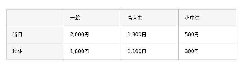 ※未就学児、障がい者手帳等をお持ちの方(介護者1名を含む)は無料(要証明)。障がい者手帳等は日本の法律に基づき交付されたものに限ります。