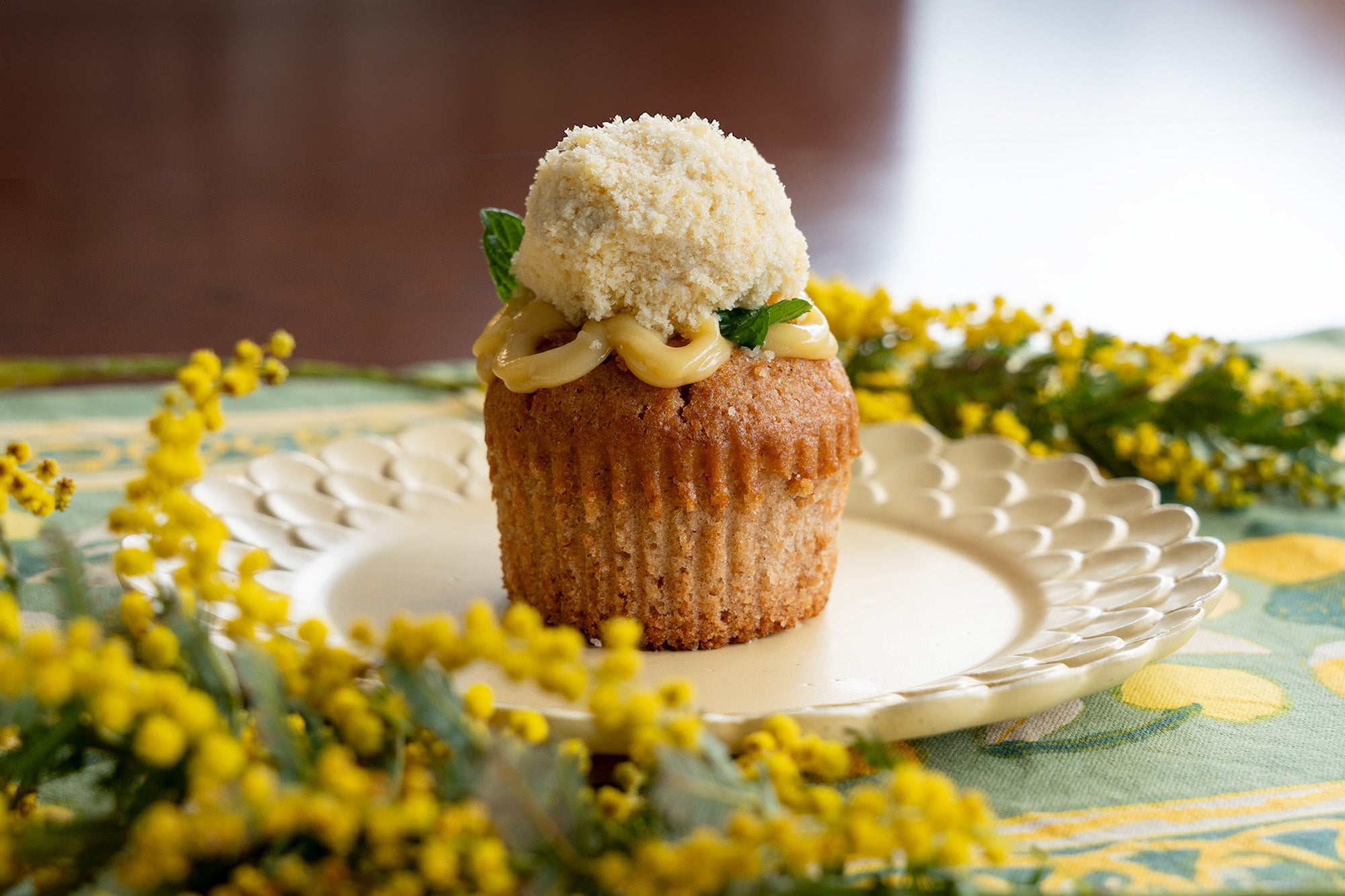 レモン香る ミモザ仕立てのプレーンバニラマフィン自家製プラントベースマフィンのプレーンバニラに、レモンケーキを練り込んだヘーゼルナッツ味のオーガニックジェラートをのせて。