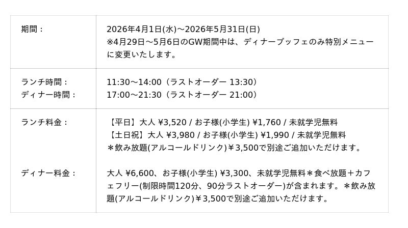 両地域の食文化を掛け合わせた、ここでしか味わえない春のブッフェをご提供いたします。