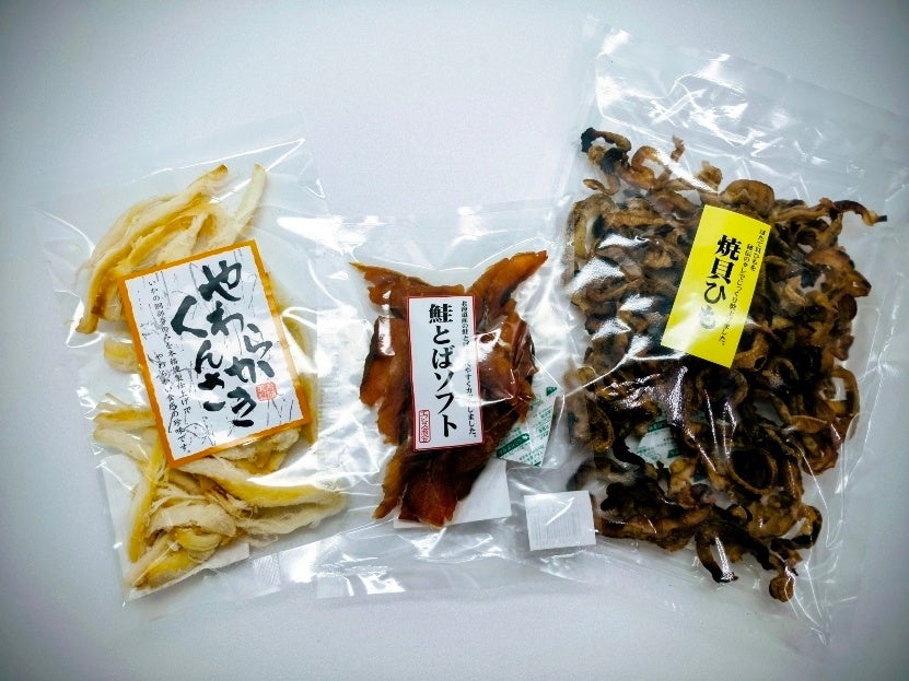 〈エビス商会〉やわらくくんさき(100g)、鮭とばソフト(60g)、焼貝ひも(120g)