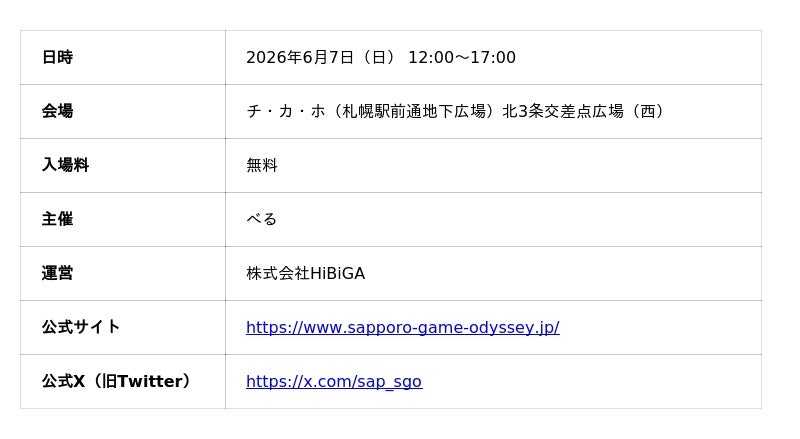 株式会社HiBiGA(本社:北海道札幌市、代表取締役社長:酒井勇紀、以下HiBiGA)は、2026年6月7日(日)、チ・カ・ホ(札幌駅前通地下広場)北3条交差点広場(西)にて、札幌発のインディーゲームの展示・試遊イベント『SAPPORO GAME ODYSSEY(サッポロ・ゲーム・オデッセイ)』を開催いたします。