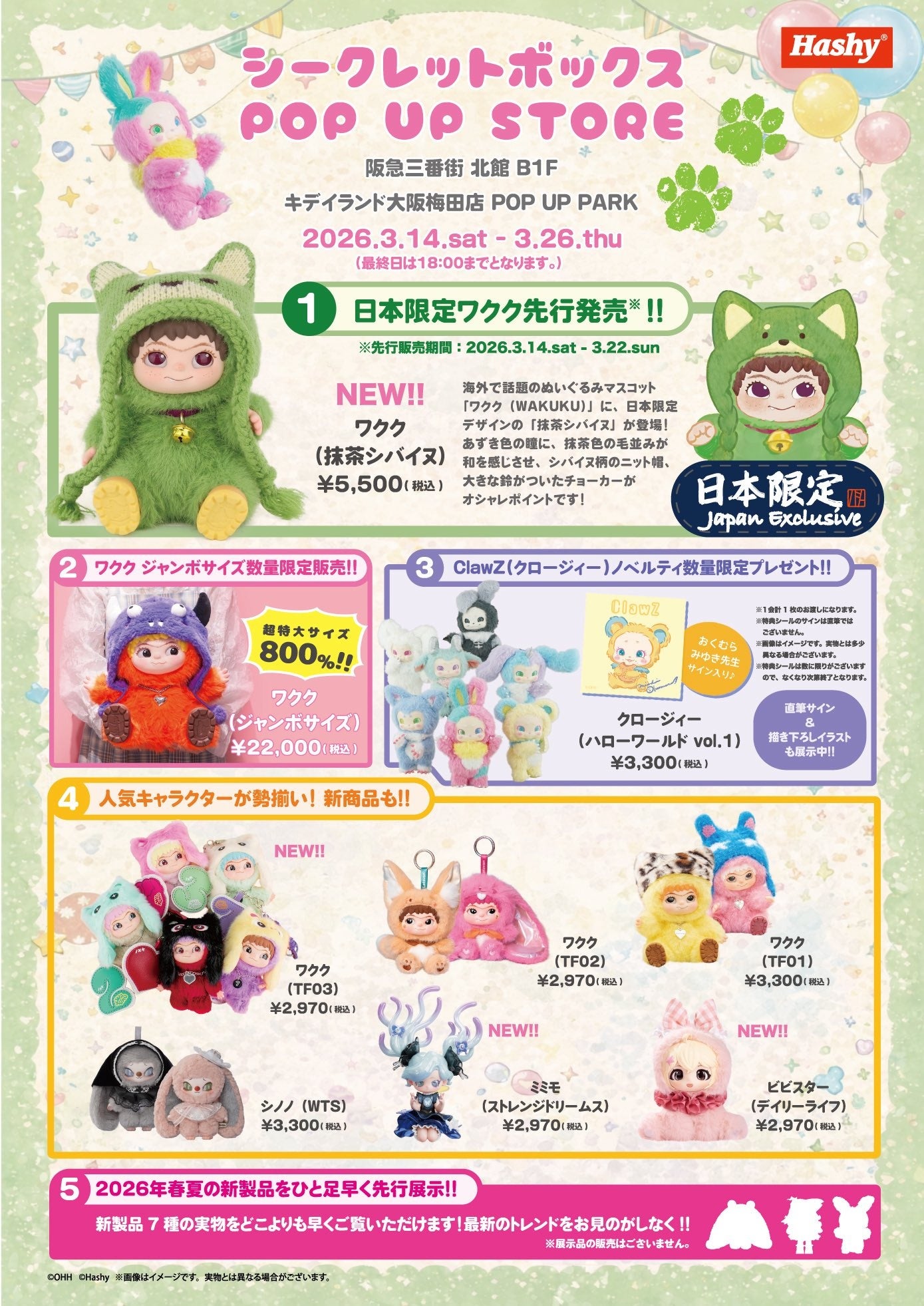 本イベントでは、海外でも話題のぬいぐるみマスコットシリーズ 「ワクク(WAKUKU)」の日本限定商品「抹茶シバイヌ」 を先行販売するほか、人気シリーズ 「ClawZ(クロージィー)」 をはじめとするシークレットボックス商品を多数展開。さらに、2026年春夏発売予定の新商品展示など、ブランドの世界観を体感できる内容となっています。