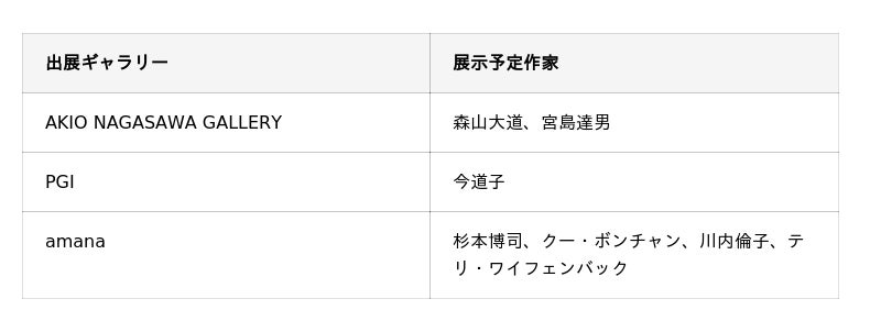 出展ギャラリーおよび展示予定作家は以下のとおりです。