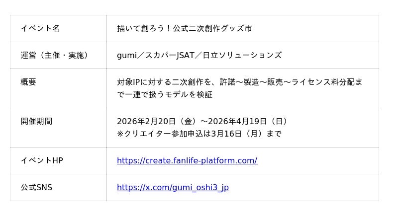 学校法人吉田学園 アミューズメントメディア総合学院(東京都渋谷区/理事長:吉田 東吾、以下 AMG)は、株式会社gumi、スカパーJSAT株式会社、株式会社日立ソリューションズが、コンテンツ業界における二次創作文化を、クリエイターがより安心して楽しめるものにするために実施する「描いて創ろう!公式二次創作グッズ市」を活用した実証(PoC)に協力いたします。