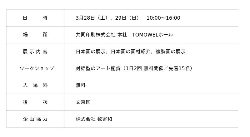 本展はその一歩として、現代作家による迫力のある『原画』と、時代を築いた巨匠の『複製画』を多数取り揃え、皆さまにアートを通じて春の訪れを感じていただける内容となっています。また、複数名で絵画にじっくりと向き合い、お互いの感じたことや考えを言葉にして分かち合う企画として「対話型のアート鑑賞」ワークショップも開催します。ぜひご参加ください。