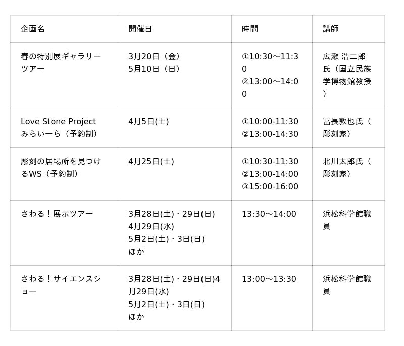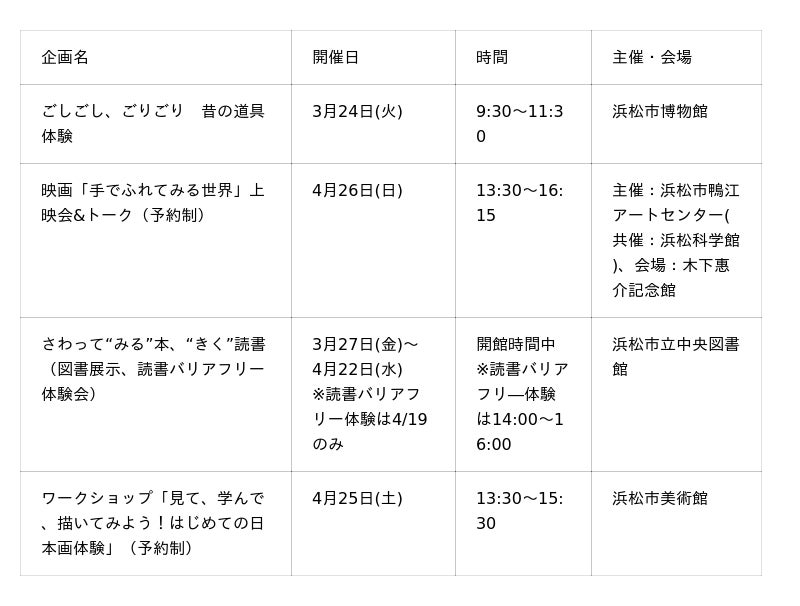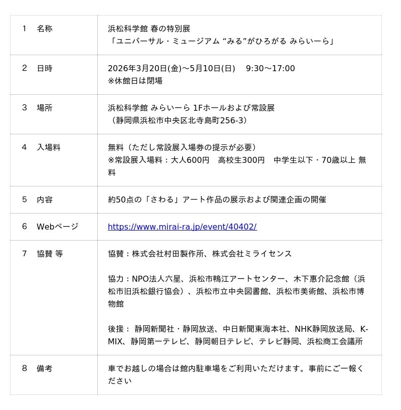 浜松科学館は、2026年3月20日(金)~5月10日(日)まで、春の特別展「ユニバーサル・ミュージアム “みる”がひろがる みらいーら」を開催します。本展は、国立民族学博物館 教授の広瀬浩二郎氏※1の監修する、「さわる」アート作品の体験を通して、視覚偏重になりがちなミュージアム、そして社会の再考を問いかける展示会です。これまでに九州~西日本の美術館・博物館等で同展が開催され、中部(東日本)かつ科学館では初開催となります。