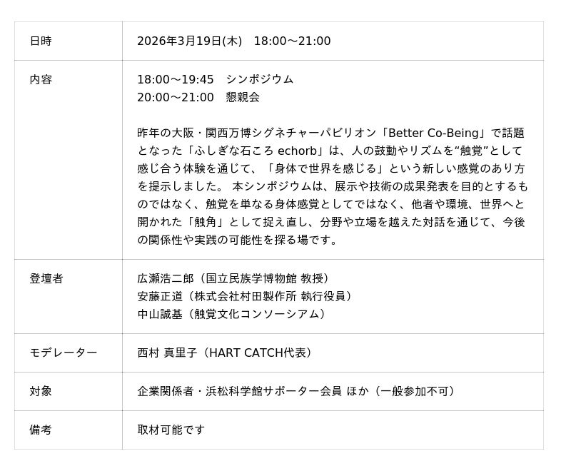 下記日程にて、プレス・関係者様向けの内覧会を開催します。また、関連イベントとして「触覚文化コンソーシアム キックオフ・シンポジウム」を開催いたします。ぜひお越しくださいますよう、お願い申し上げます。