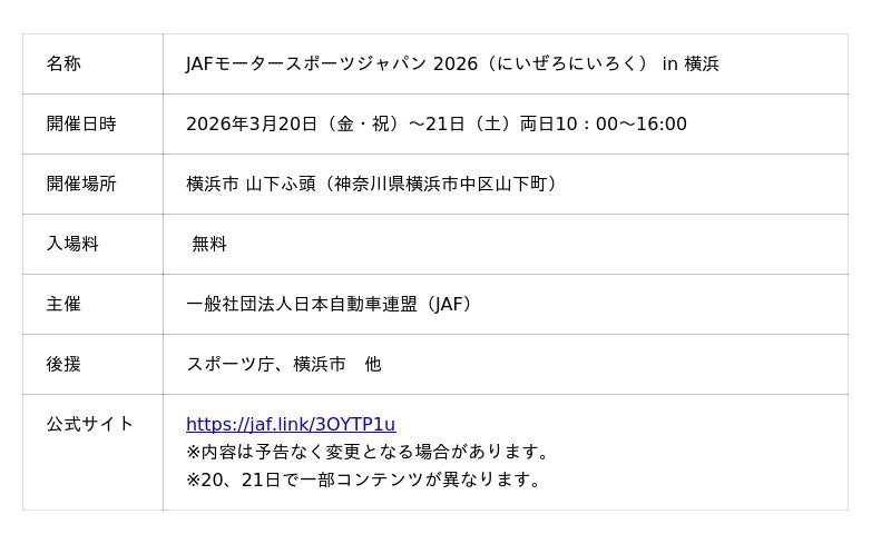 JAF(一般社団法人日本自動車連盟 会長 坂口正芳)は、2026年3月20日(金・祝)~21日(土)に開催される大規模モータースポーツイベント「JAFモータースポーツジャパン 2026 in 横浜」において、レース車両の迫力あるデモンストレーション走行や白バイ隊パフォーマンス、子どもから大人まで楽しめる体験型コンテンツなど、多彩なプログラムを実施します。