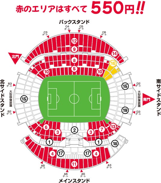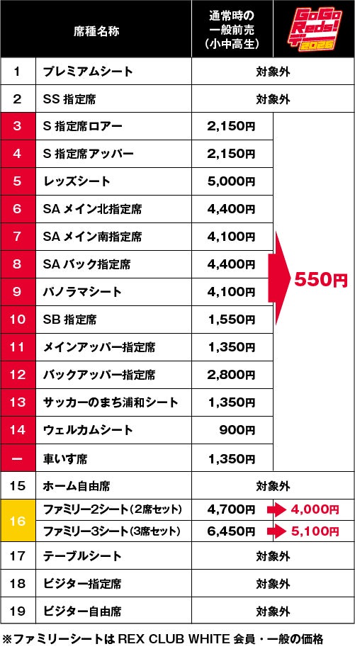 当試合は特別に、小中高生指定席のチケット料金を『Go(ゴー)Go(ゴー)Reds(レッズ)!料金』の550円(税込)で販売いたします。※一部席種除く