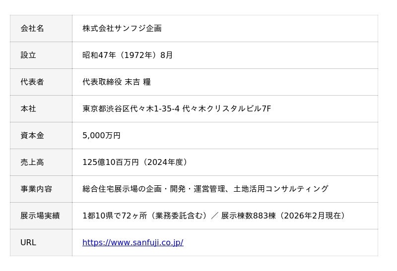 総合住宅展示場の企画・運営で1都10県・72ヶ所・883棟(2026年2月現在)を展開する株式会社サンフジ企画(本社:東京都渋谷区、代表取締役:末吉 糧)は、2026年4月18日(土)、新潟県三条市上須頃に「新潟県央住宅公園」をグランドオープンいたします。
