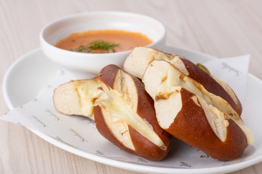 香ばしくグリルしたプレッツェルブレッドに、甘みを引き出したソテーオニオンと、とろけるグリュイエールとモッツアレラチーズ。