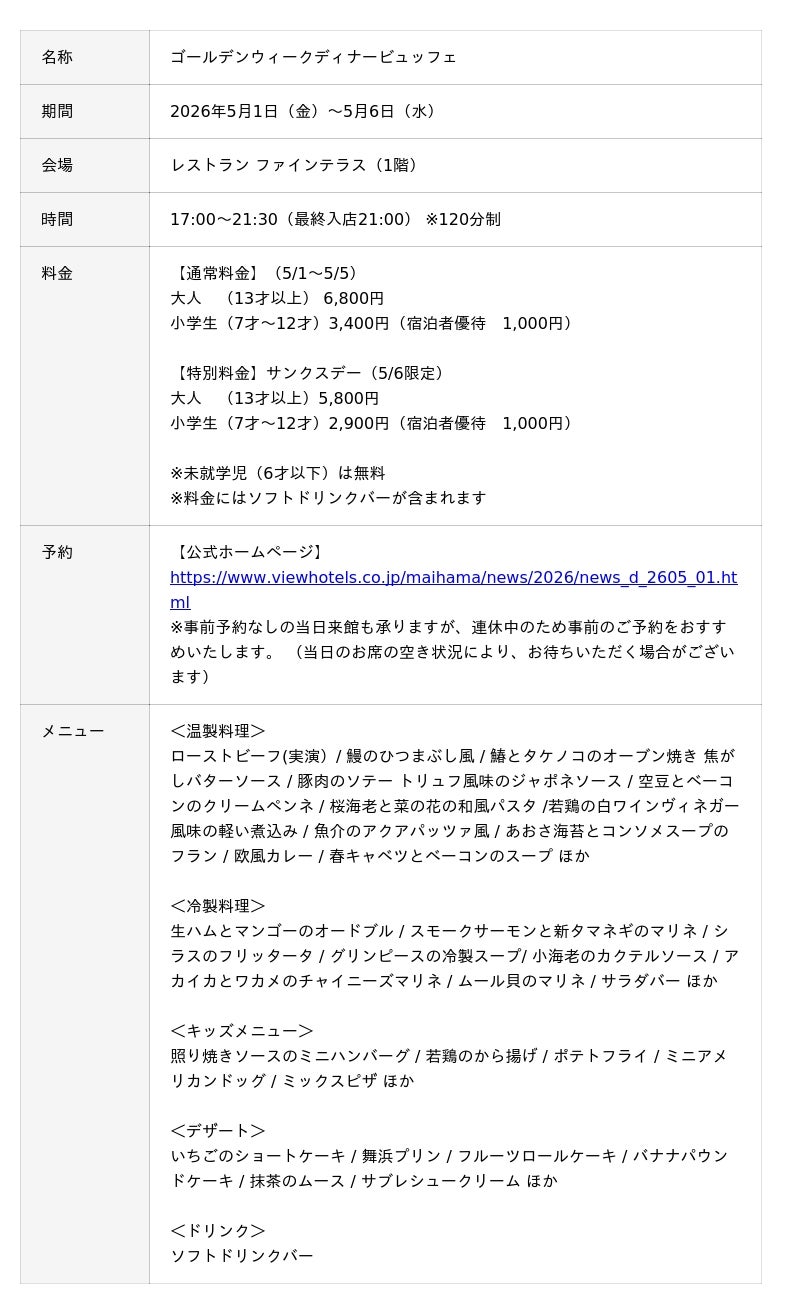 舞浜ビューホテル by HULIC(所在地:千葉県浦安市、総支配人:鈴木裕樹、運営:ヒューリックホテルマネジメント株式会社)は、2026年5月1日(金)から5月6日(水)までのゴールデンウィーク期間中、1階「レストラン ファインテラス」にて、初夏の訪れを祝う「ゴールデンウィークディナービュッフェ」を開催いたします。