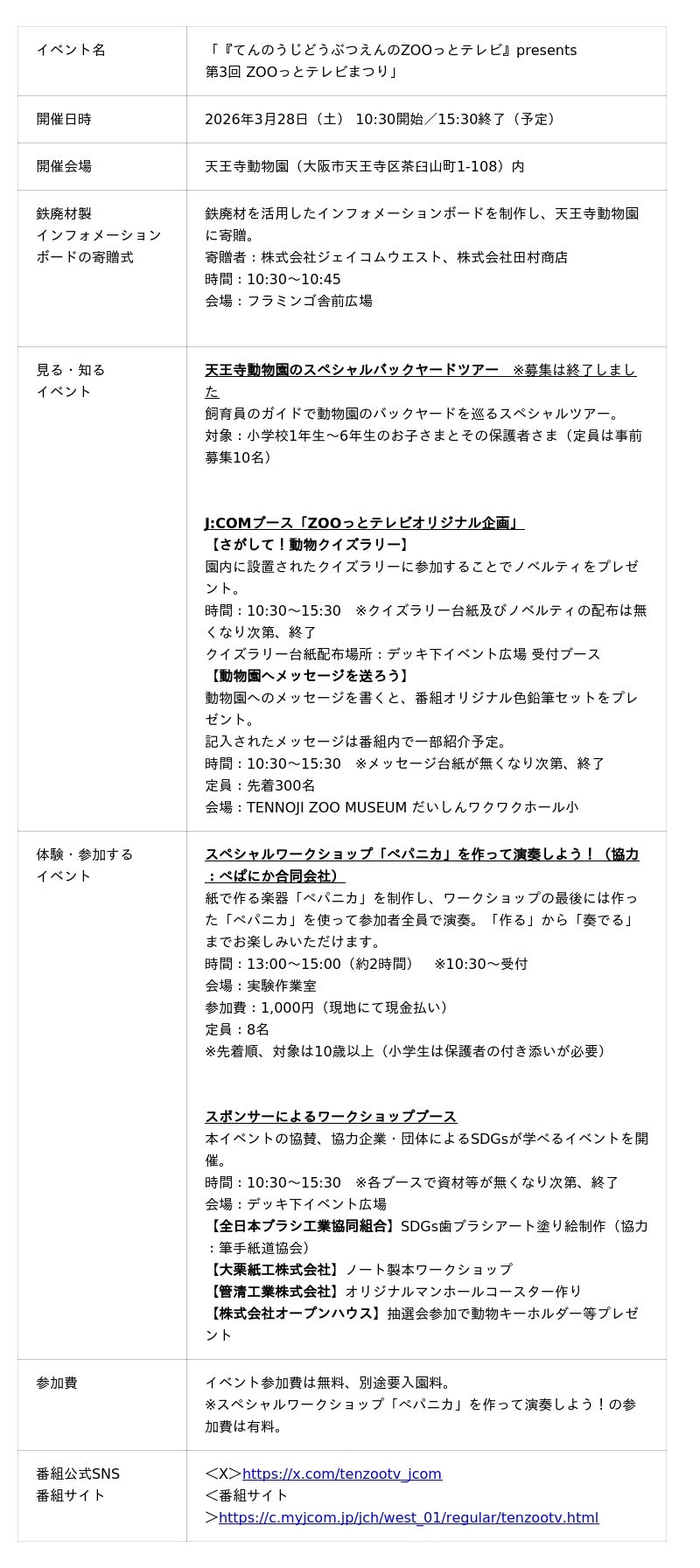 これからもJ:COMと天王寺動物園は、地域のステークホルダーと連携し、番組やイベントでの情報発信を通じて、SDGsについて考える機会の創出と、地域の皆さまに楽しさや感動をお届けしてまいります。