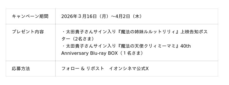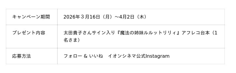 全国に「イオンシネマ」98劇場を運営するイオンエンターテイメント株式会社(本社:東京都港区、代表取締役社長 藤原信幸)は、TVアニメ『魔法の姉妹ルルットリリィ』の放映開始に先駆け、イオンシネマ10劇場で2026年3月20日(金・祝)より先行上映を実施いたします。また、上映を記念して、3月下旬より順次『魔法の姉妹ルルットリリィ』のイオンシネマオリジナルグッズを全劇場のグッズ売場で販売予定です。