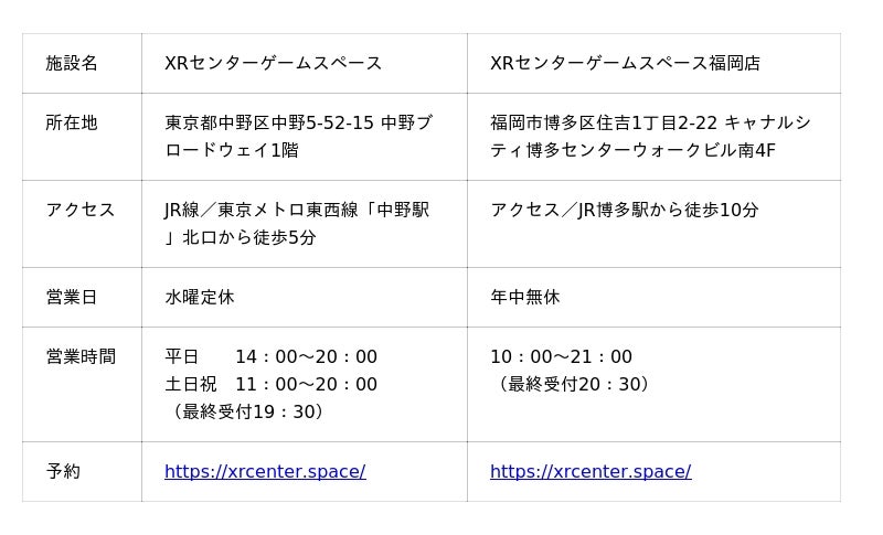 本アトラクションは、中野ブロードウェイ内「XRセンターゲームスペース」と、キャナルシティ博多内「XRセンターゲームスペース福岡店」の直営2店舗で体験可能です。