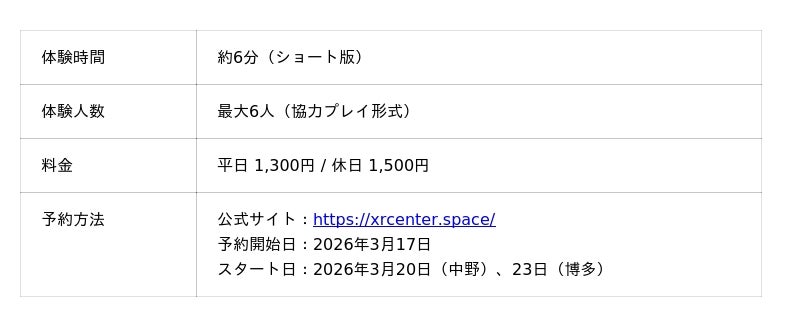 本アトラクションは、中野ブロードウェイ内「XRセンターゲームスペース」と、キャナルシティ博多内「XRセンターゲームスペース福岡店」の直営2店舗で体験可能です。
