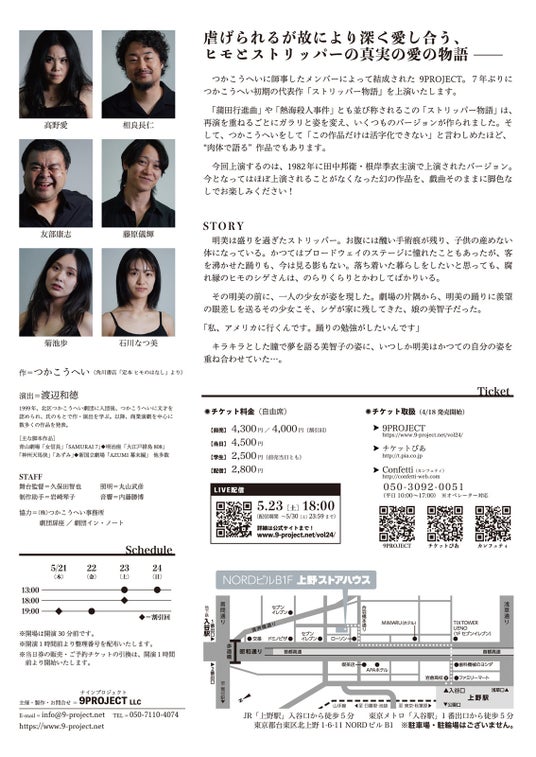 9PROJECT主催、『ストリッパー物語』が2026年5月21日 (木) ~ 2026年5月24日 (日)に上野ストアハウス(東京都台東区北上野1-6-11)にて上演されます。 チケットはカンフェティ(運営:ロングランプランニング株式会社、東京都新宿区、代表取締役:榑松 大剛)にて4月18日(土)10:00より発売されます。