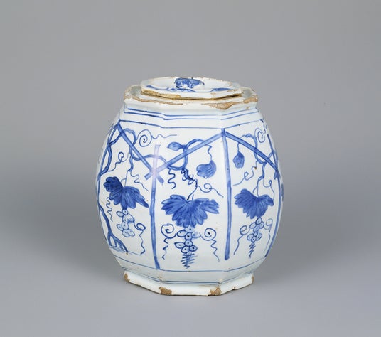 中国・江西省景徳鎮の民窯で、天啓年間(1621~27)を中心に、日本向けに生産された古染付。八角の胴部に葡萄と棚が描かれた本作は定番品である。