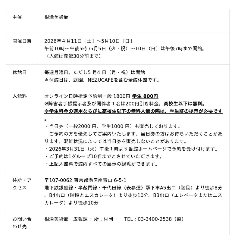 本特別展より、学生料金を値下げし、さらに学生料金適用の対象を従来の「高校生以上」から「大学生以上」に変更し、無料入館対象を拡大いたします。(一般料金はすでにご案内済みの情報から変更ありません。)オンライン日時指定予約制 一般 1800円 学生 800円
