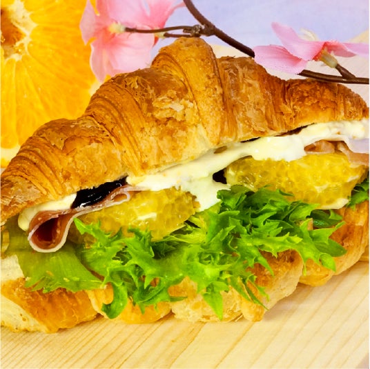 発酵バターの香り豊かなクロワッサンに、みずみずしい八朔と鶏生ハムをサンド。クリームチーズソースとバルサミコソースが、八朔の甘酸っぱさを引き立てる爽やかなサンドイッチです。