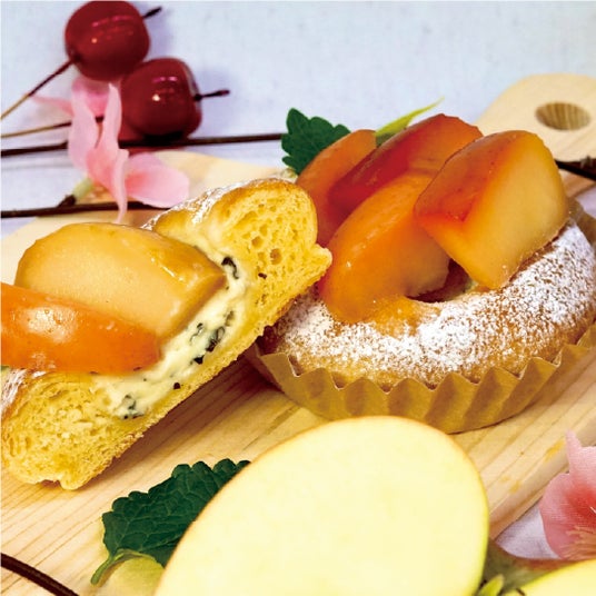 しっとりとしたブリオッシュ生地に、レモンバーム・りんごピューレ・クリームチーズを合わせた自家製チーズクリームを絞り、りんごのコンポートをトッピング。