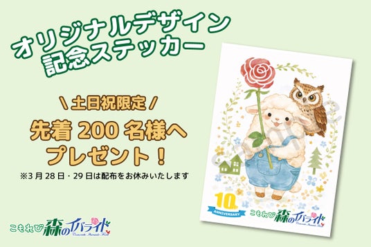 こもれび森のイバライド10周年を記念して、3月20日(金祝)から4月19日(日)までの毎週末、その日の先着200名様へオリジナルシールを配布いたします。配布は入園ゲートをくぐってすぐの花畑前。スタッフが手渡しでお渡しいたします。記念としてぜひお持ち帰りください。※3月28・29日は園内マーケットイベント実施のため、配布をお休みいたします。