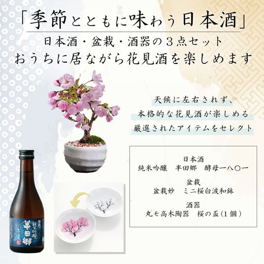 桜のミニ盆栽、日本酒、桜咲く盃の3点セットで、天候や時間を気にせず楽しめる