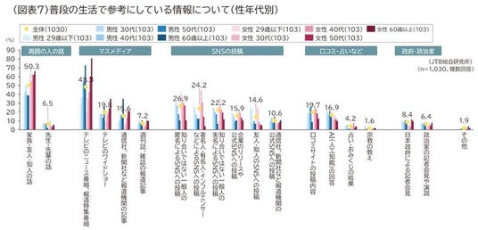 性年代別にみると、マスメディアは年代が上になるほど高く、SNSや口コミ、AIは若い年代ほど選択率が高くなりました。図表は掲載していませんが、前年と比較すると「知り合いではない一般人の匿名によるSNS・YouTubeへの投稿」「AI(人工知能)の回答」はすべての属性で増加していました(図表7)